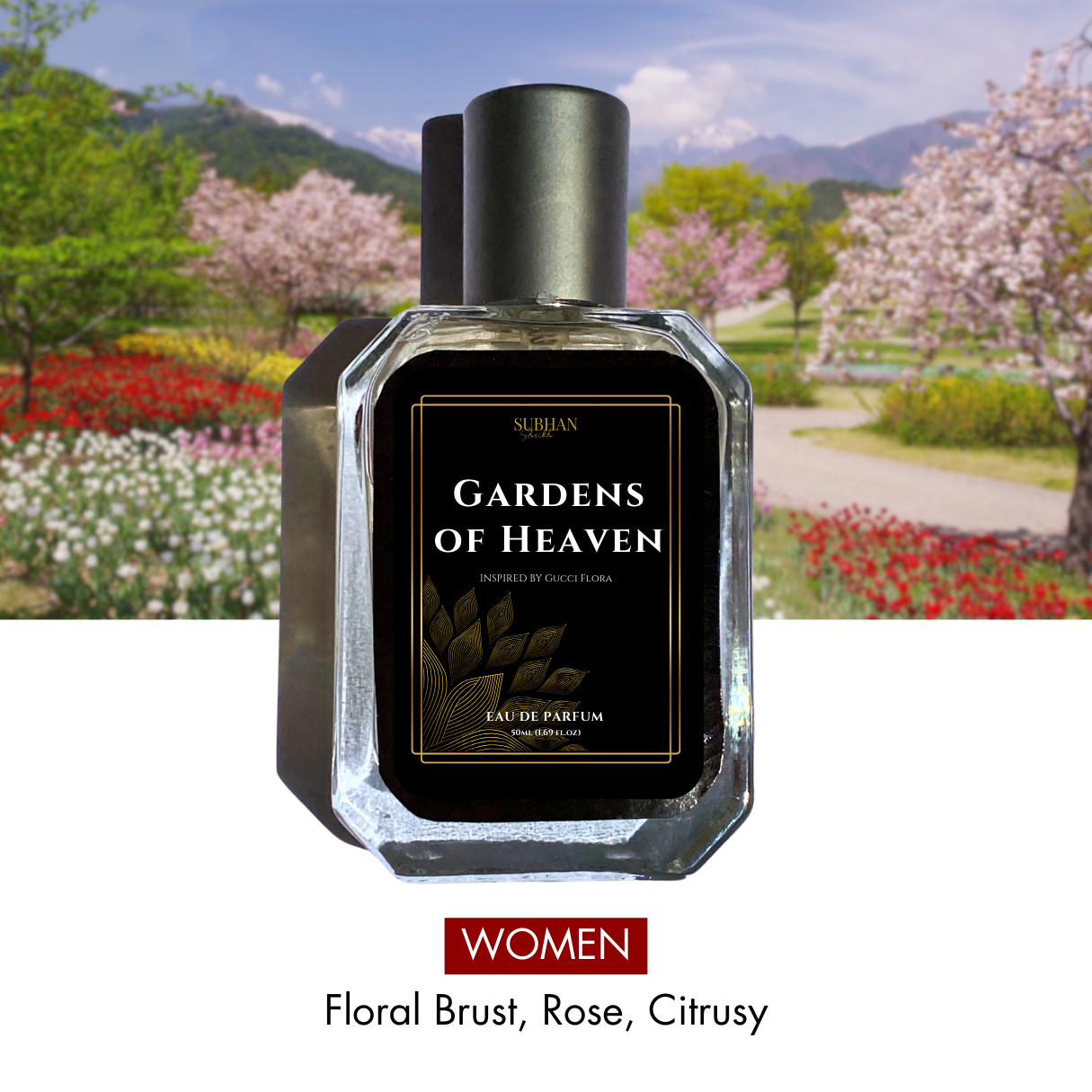 Introducing Gardens of Heaven, a perfume inspired by Gucci Flora. Immerse yourself in a paradise of vibrant florals, with notes of rose, jasmine, and blossoms that will uplift your spirits and delight your senses. Experience the sensory journey of this fragrance, enveloped in a garden bursting with colorful blooms.